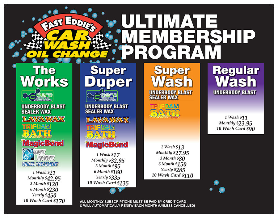 Our Ultimate Wash Program is an excellent option for the frequent washers and allows you to maintain the beauty of your vehicle stress-free. Membership is good at all of our 17 locations across the state. We offer different tiered memberships to fill all of your needs. We invite you to visit our local Fast Eddie’s today.